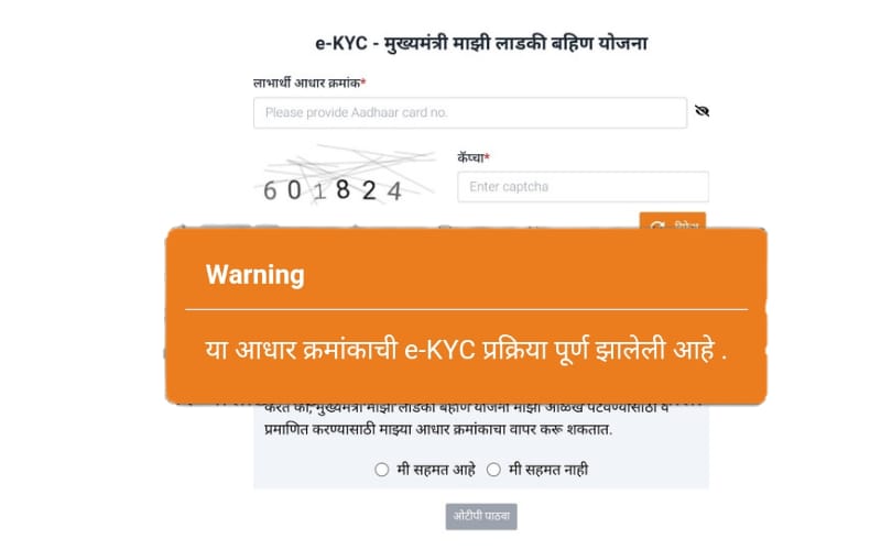 | E-KYC Completed आहे का ते तपासणे | आधार क्रमांक व OTP द्वारे | https://ladkibahin.maharashtra.gov.in |